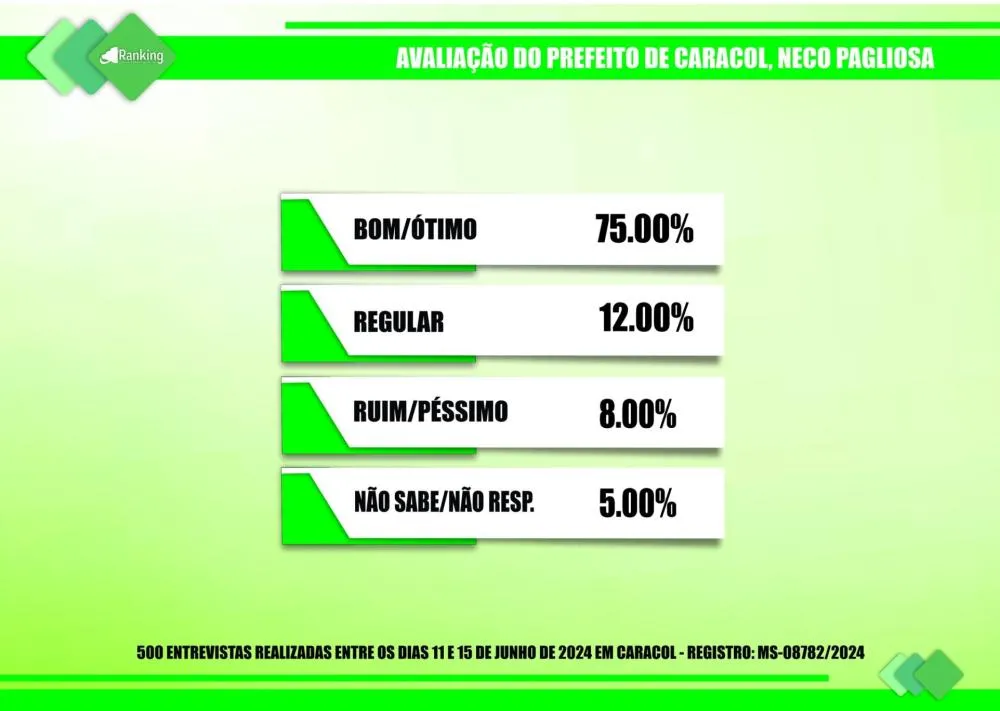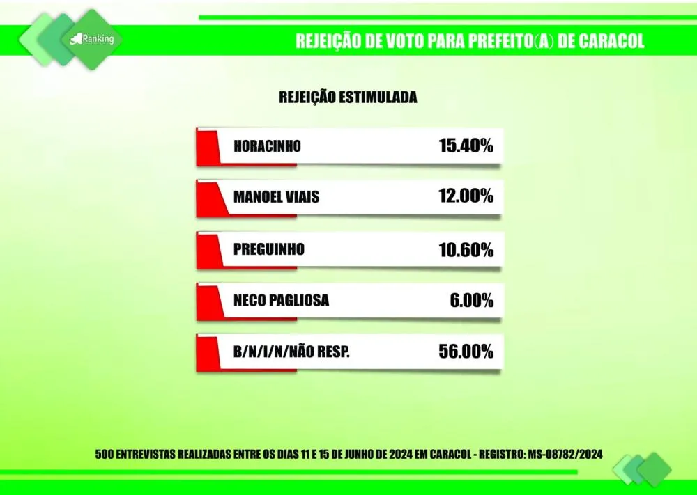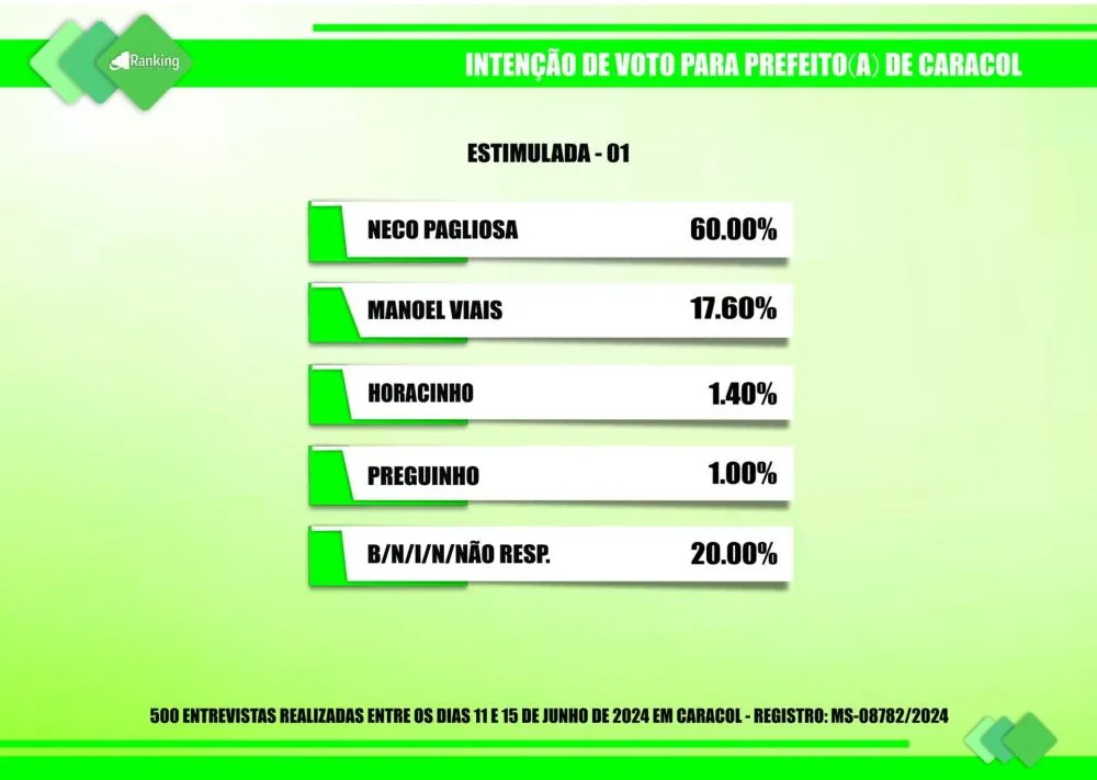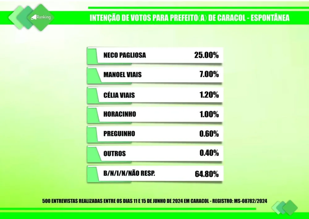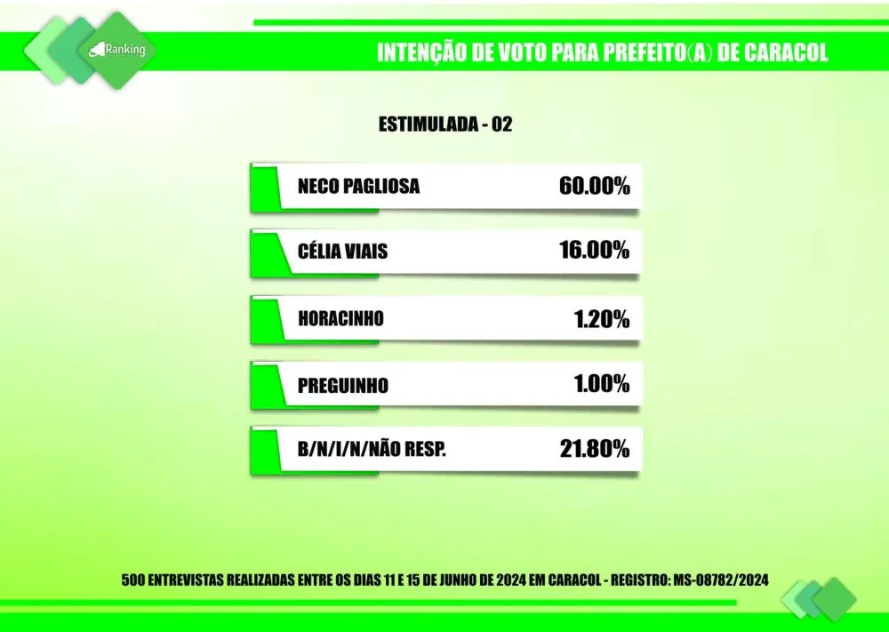 Por encomenda do site Diário MS News e registrada no TSE (Tribunal Superior Eleitoral) sob o nº MS-08782/2024, o Instituto Ranking Brasil Inteligência realizou, no período de 11 a 15 de junho deste ano, junto a 500 moradores de Caracol (MS), com 16 anos ou mais de idade, uma pesquisa de intenção de votos para a Prefeitura Municipal nas eleições 2024, tendo intervalo de confiança de 95% e uma margem de erro de 4,3%, para mais ou para menos.