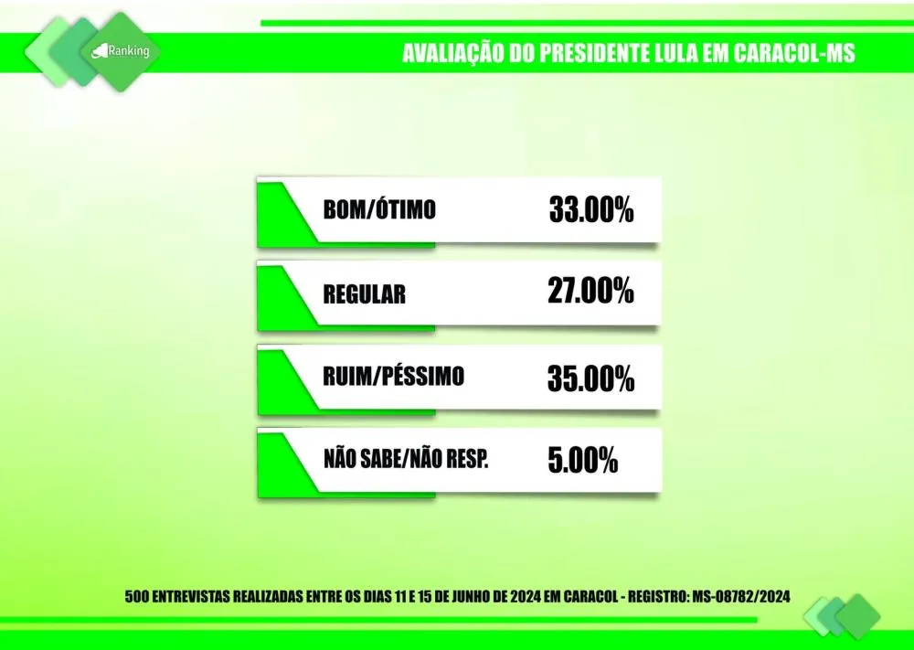 O Instituto Ranking Brasil Inteligência avaliou a gestão do presidente da República, Luiz Inácio Lula da Silva, em Caracol e 35% dos entrevistados consideraram como ruim ou péssima, 33% como ótima ou boa, 27% como regular e 5% não sabem ou não responderam.