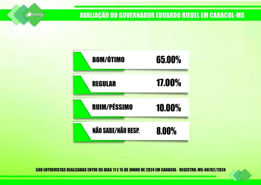 O Instituto Ranking Brasil Inteligência avaliou a gestão do governador Eduardo Riedel no município e 65% dos entrevistados consideraram como ótima ou boa, 17% como regular, 10% como ruim ou péssima e 8% não sabem ou não responderam.