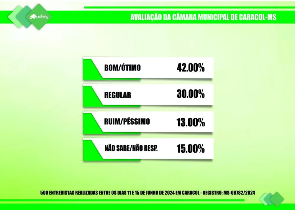 O Instituto Ranking Brasil Inteligência ainda avaliou a Câmara Municipal de Caracol e 42% dos entrevistados consideraram a Casa de Leis como ótima ou boa, 30% como regular, 13% como ruim ou péssima e 15% não sabem ou não responderam.