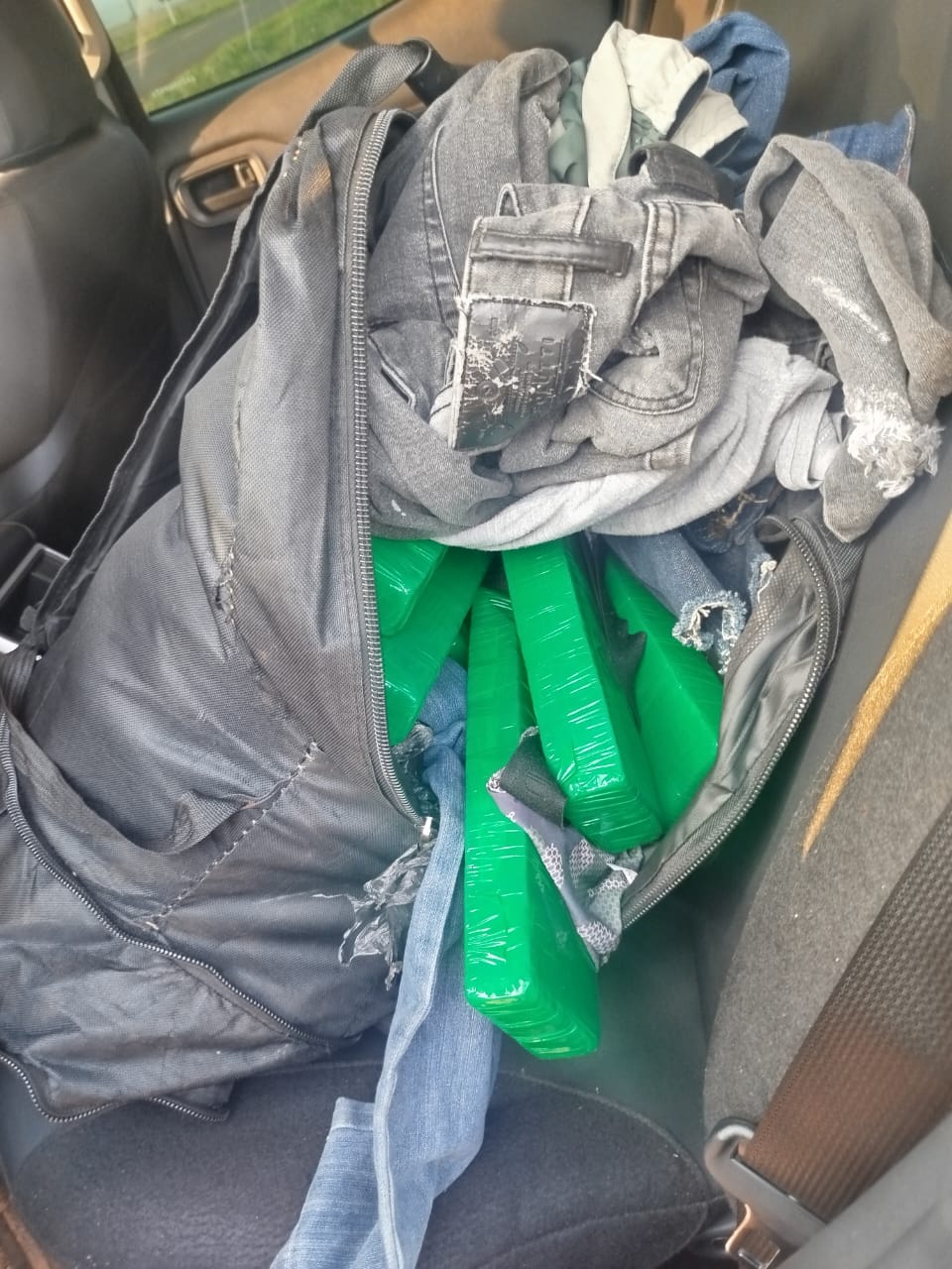 Com base nas informações levantadas, a equipe policial realizou a abordagem do veículo no momento em que este adentrava o perímetro urbano de Tacuru. Durante a vistoria, foram localizadas duas mochilas que pertenciam aos suspeitos. Dentro das mochilas foram encontrados diversos tabletes de maconha, totalizando cerca de 16 quilos.