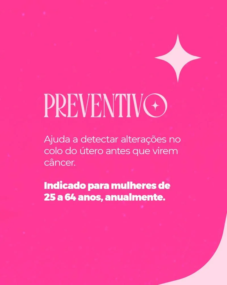 O exame preventivo (Papanicolau) é indicado para mulheres de 25 a 64 anos, devendo ser feito anualmente. Já a mamografia, principal exame para detectar o câncer de mama, é recomendada para mulheres de 50 a 69 anos, com intervalo de dois anos entre cada exame.