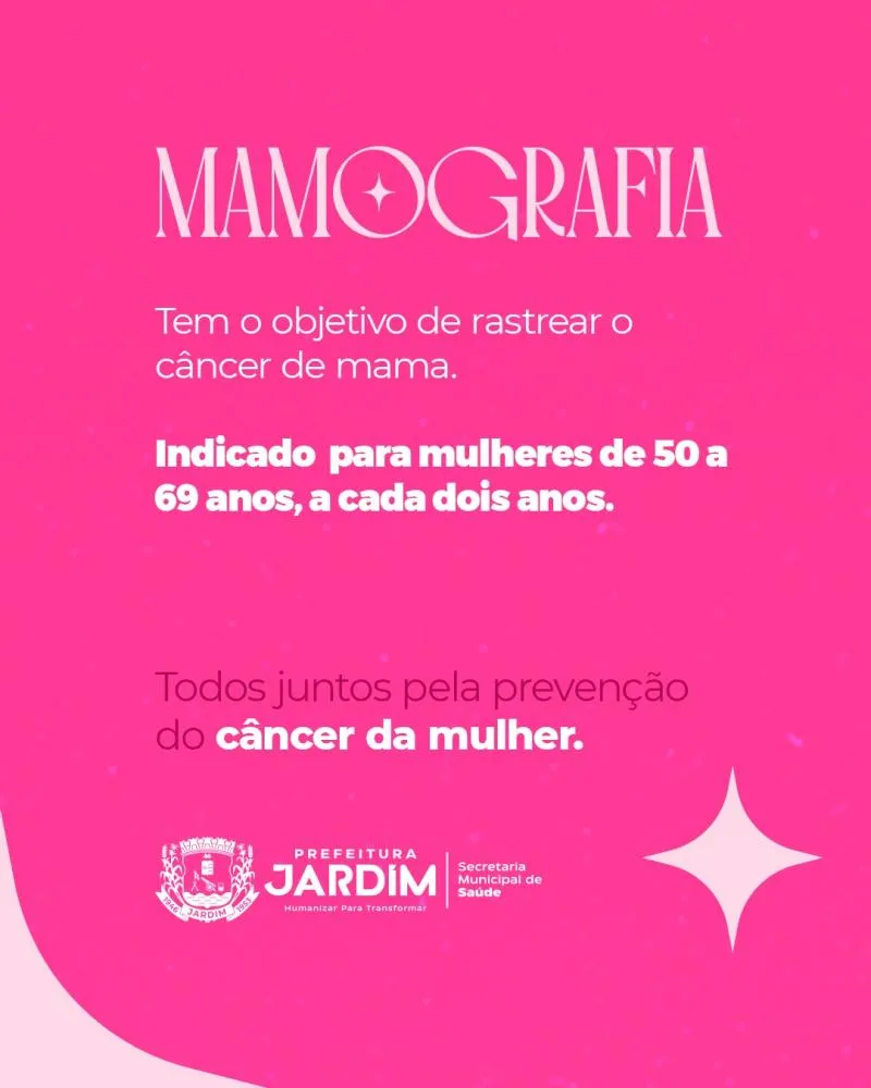 A Prefeitura Municipal de Jardim, por meio da Secretaria Municipal de Saúde, intensifica durante todo o mês de outubro as ações da Campanha Outubro Rosa, movimento mundial de conscientização sobre a prevenção e o diagnóstico precoce do câncer de mama e do colo do útero.