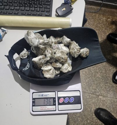 Durante buscas no interior do imóvel, os policiais localizaram, dentro de um urso de pelúcia, 28 porções de maconha, totalizando aproximadamente 136 gramas, além de uma balança de precisão, papéis para embalo e uma máquina de cartão de crédito — itens comumente utilizados na comercialização de drogas.
