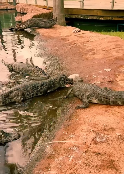 Mais adiante, em outros tanques, era possível encontrar pedaços desmembrados de “corpo”, como pés e até uma mão sendo comida por um jacaré.