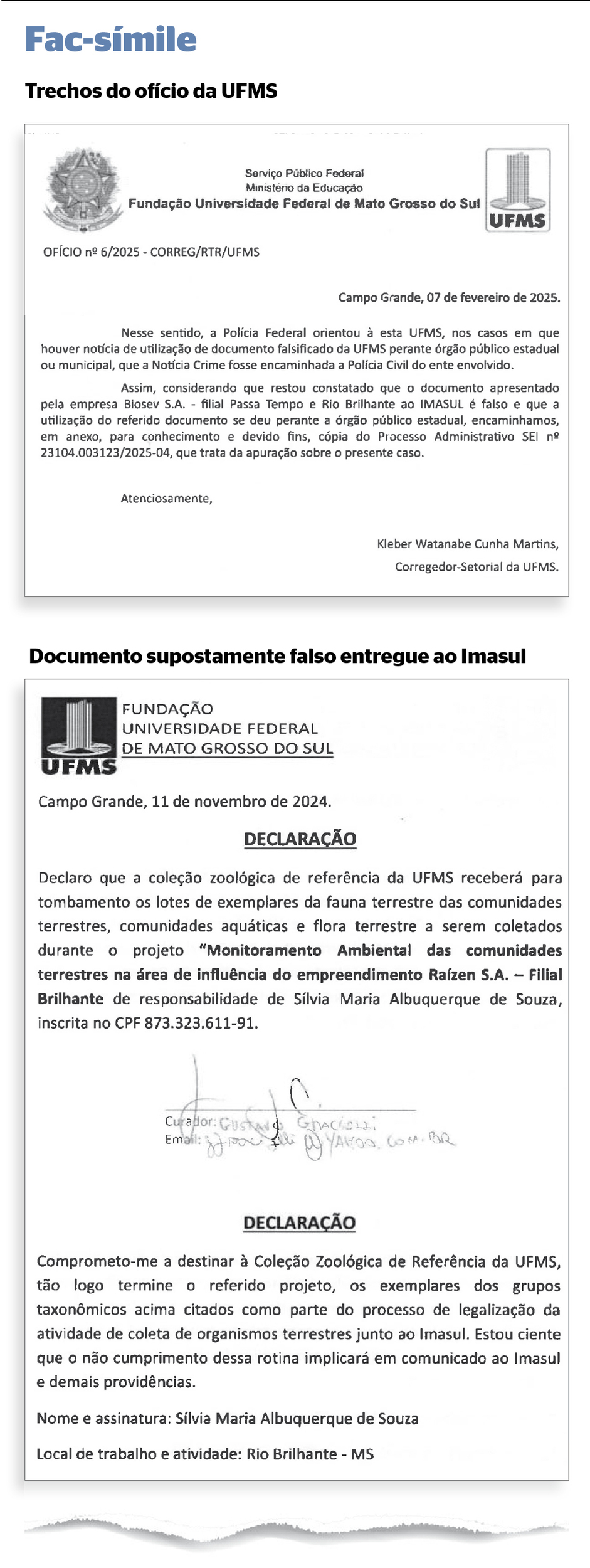 Além disso, a estética, o logotipo da UFMS e o padrão do documento investigado não condizem com as cartas de anuência emitidas pela universidade. O documento anexado pela Raízen ainda trazia o termo “Coleção Zoológica de Referência da Universidade Federal de Mato Grosso do Sul”, no entanto, desde 2019, o nome oficial da unidade de apoio passou a ser Coleção Zoológica da Universidade Federal de Mato Grosso do Sul.