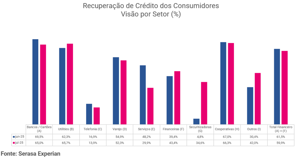 No cenário nacional, a regularização de contas atrasadas do setor financeiro atingiu 59,9% em julho. Também houve maior adimplência nos segmentos de bancos/cartões (65%), utilities (65,7%), varejo (52,3%) e instituições financeiras (43,4%).