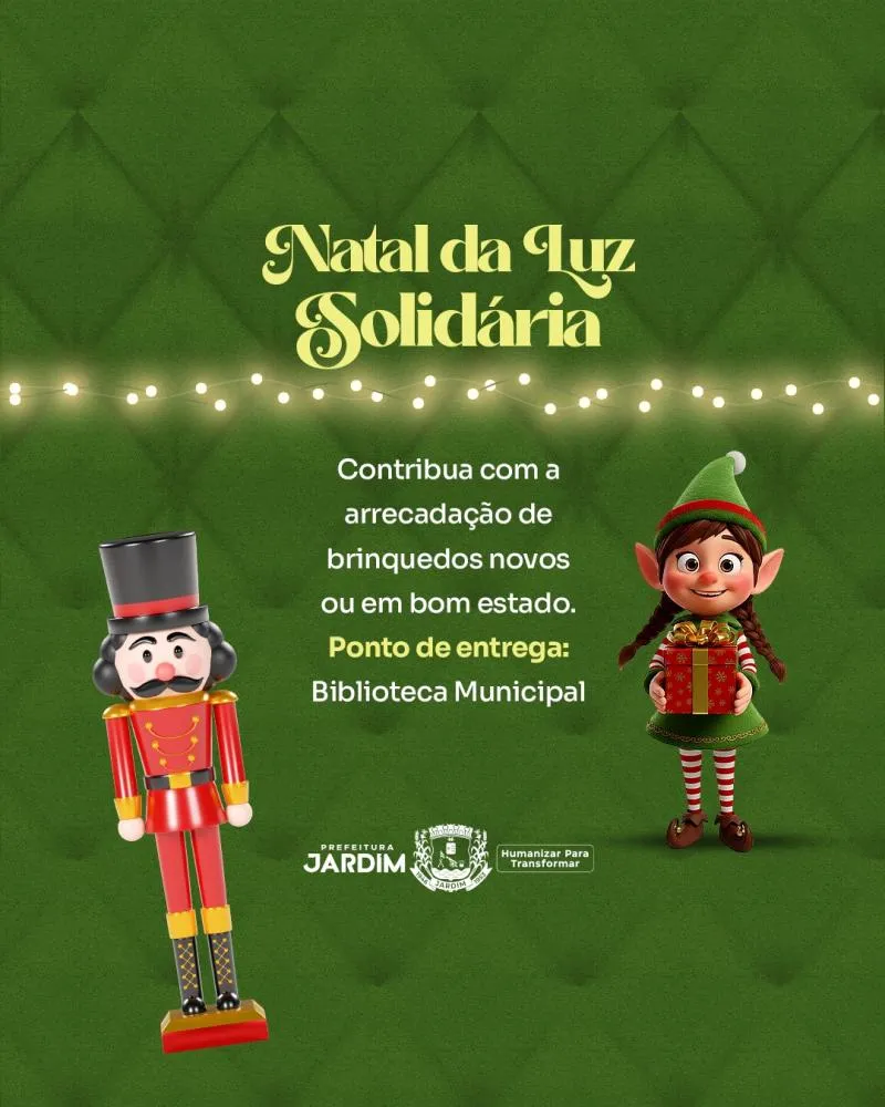 A programação reforça valores como união, esperança e solidariedade, convidando as famílias a vivenciarem juntas esse momento especial. Paralelamente, a Prefeitura incentiva a participação no Natal da Luz Solidária, campanha voltada à arrecadação de brinquedos na Biblioteca Municipal. A iniciativa busca garantir um Natal mais feliz para crianças em situação de vulnerabilidade, fortalecendo o compromisso social da comunidade jardinense.