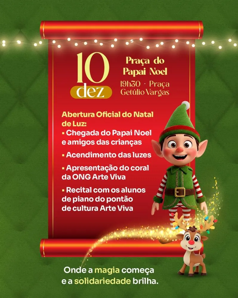 O ponto alto da noite será o acendimento oficial das luzes, que tradicionalmente marca o início das festividades no município e enche o centro da cidade de brilho, cor e emoção. A Praça do Papai Noel, como passa a ser chamada durante este período, receberá decoração temática preparada para envolver crianças e adultos em um clima de alegria e confraternização.