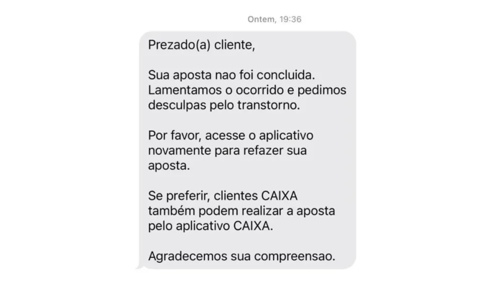 Segundo relatos, próximo ao horário do sorteio de quarta-feira (31), uma notificação via SMS alegava problemas no processamento da aposta e pedia que o apostador fizesse um novo jogo. Um dos relatos afirma que o pagamento via Pix foi realizado, porém, no aplicativo, ao conferir o bilhete, notou que a aposta não tinha sido registrada. Muitos apontam, ainda, que esse pode ser um dos motivos pelo adiamento do sorteio bilionário.
