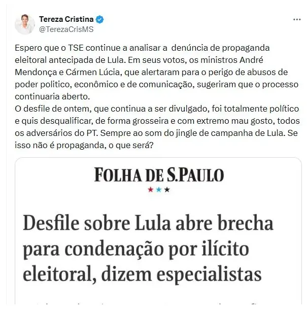 No X, antigo Twitter, a senadora compartilhou uma matéria da Folha de São Paulo dizendo que o desfile abre brecha para ilícito eleitoral.
