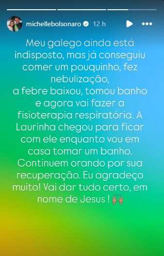 A última atualização publicada por Michelle no período da noite informa que, apesar de indisposto, Bolsonaro apresentou melhoras. Além disso, a mulher aproveita para agradecer e pedir orações pela saúde do marido.