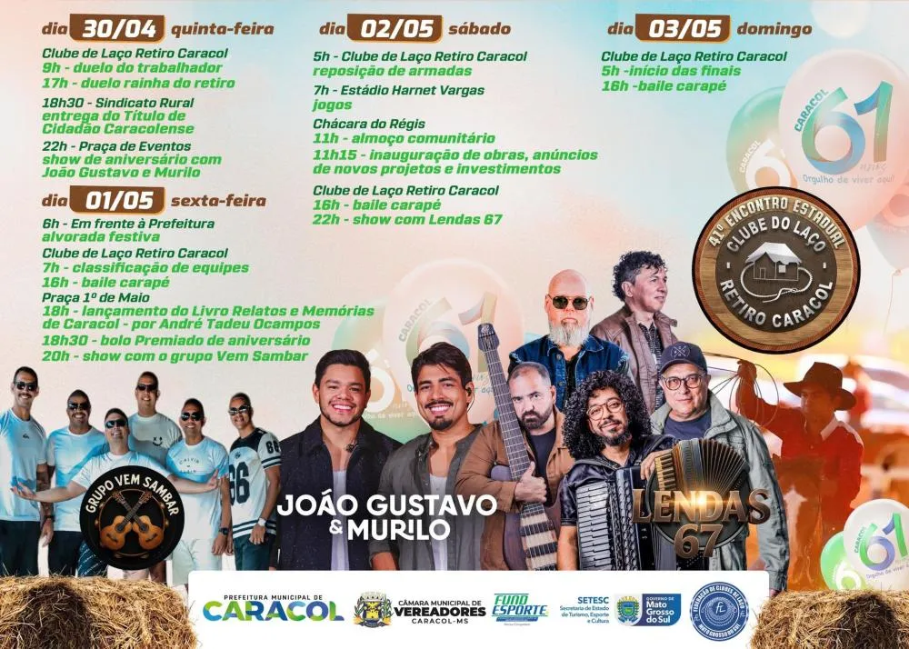 Caracol (MS) — A cidade de Caracol chega aos 61 anos com uma programação que mistura tradição campeira, cultura e entretenimento em quatro dias de festa. As comemorações do aniversário municipal acontecem de 30 de abril a 3 de maio e reúnem competições de laço, shows musicais, almoço comunitário, inauguração de obras e o lançamento de um livro sobre a história da cidade.