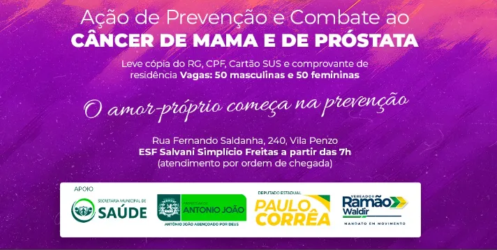 A unidade móvel do Grupo Onça-Pintada estará em Antônio João no dia 17 de abril para oferecer exames gratuitos de prevenção ao câncer de mama e próstata. O atendimento acontece na ESF Salvani Simplício Freitas, na Vila Penzo, a partir das 7h, por ordem de chegada.